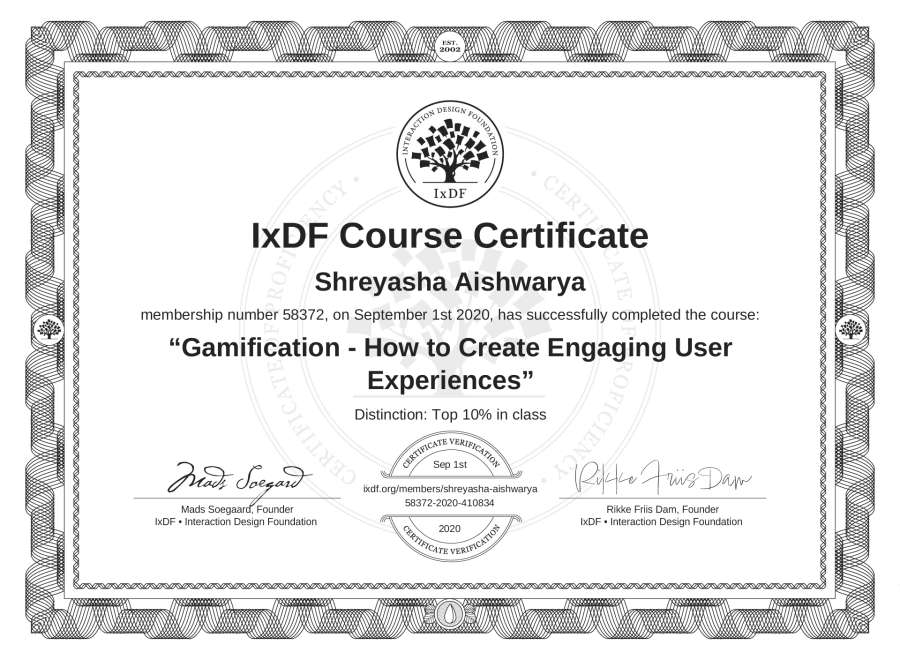 Shreyasha Aishwarya's IxDF Course Certificate: Gamification - How to Create Engaging User Experiences