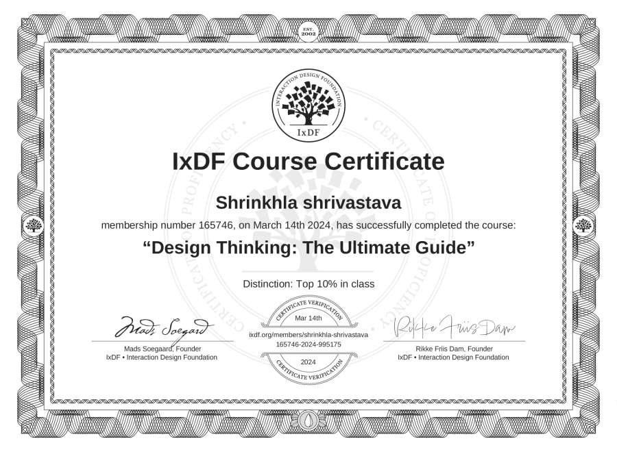 Shrinkhla shrivastava's IxDF Course Certificate: Design Thinking: The Ultimate Guide