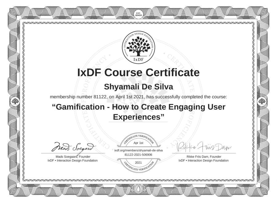 Shyamali De Silva's IxDF Course Certificate: Gamification - How to Create Engaging User Experiences