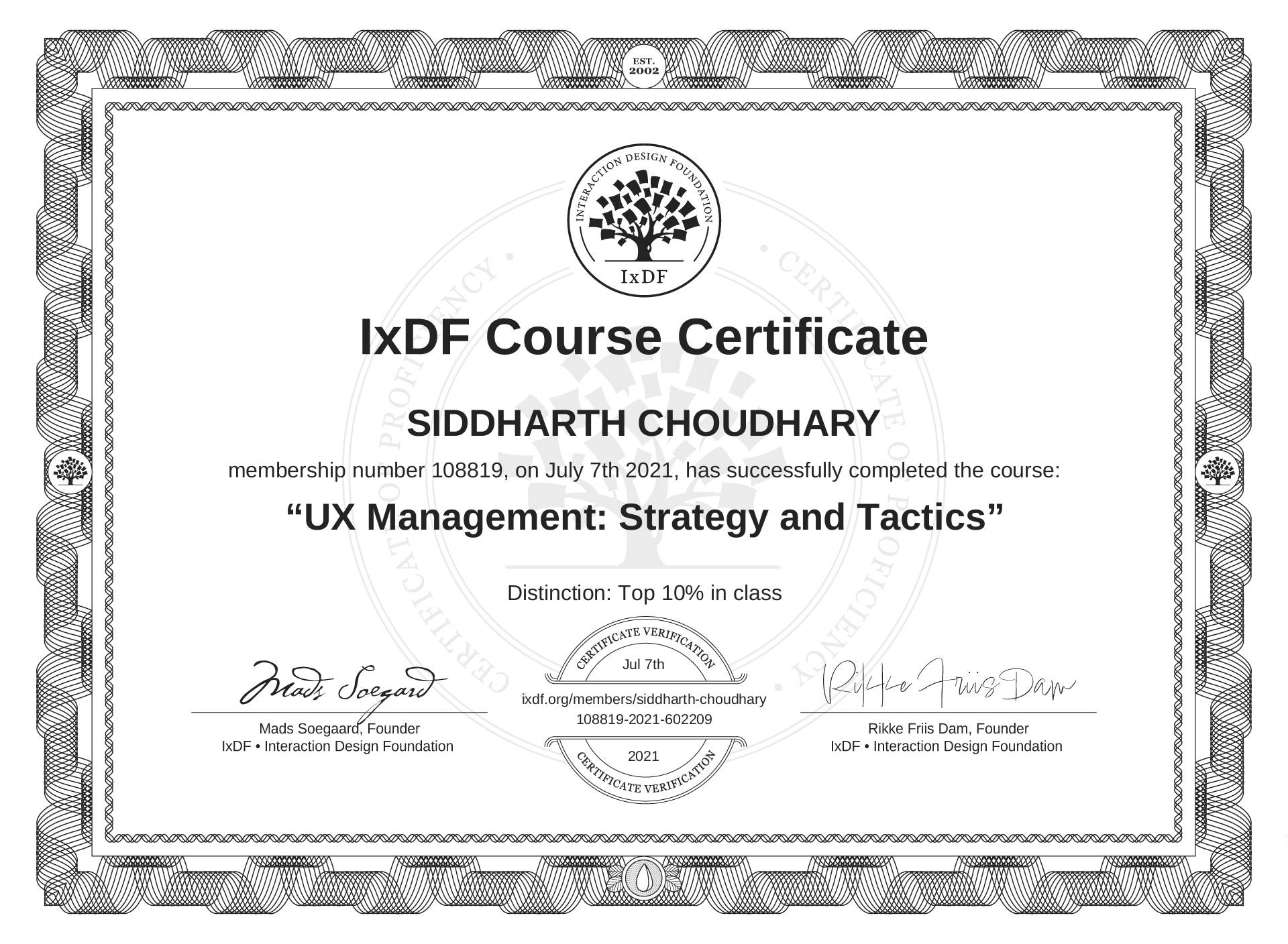 SIDDHARTH CHOUDHARY's IxDF Course Certificate: UX Management: Strategy and Tactics