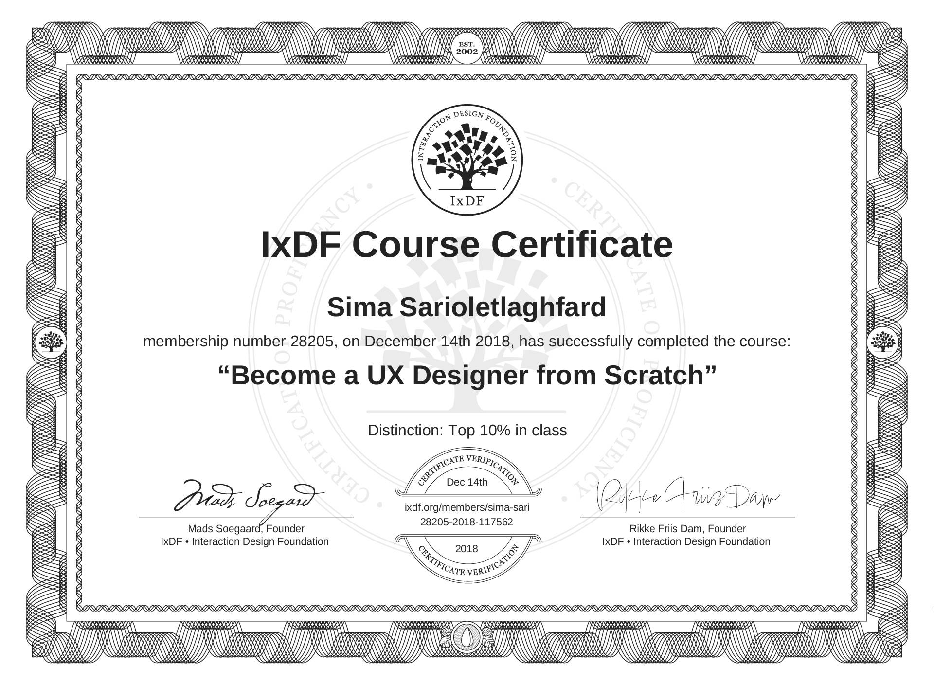 The IxDF Course Certificate above is awarded to Sima Sarioletlaghfard with a Top 10% Distinction in formal recognition of their coursework surpassing the rigorous benchmarks of exceptional performance established by the IxDF Educational Codex.
