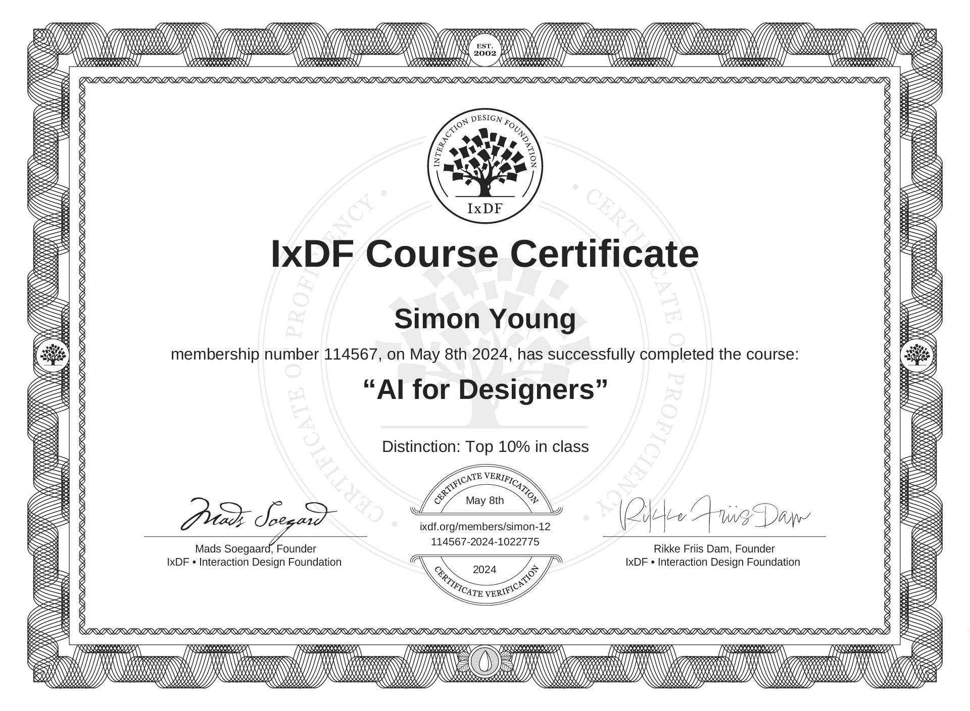 The IxDF Course Certificate above is awarded to Simon Young with a Top 10% Distinction in formal recognition of their coursework surpassing the rigorous benchmarks of exceptional performance established by the IxDF Educational Codex.
