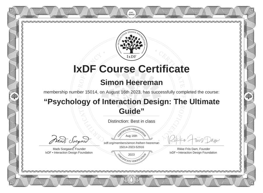 Simon Heereman's IxDF Course Certificate: Psychology of Interaction Design: The Ultimate Guide