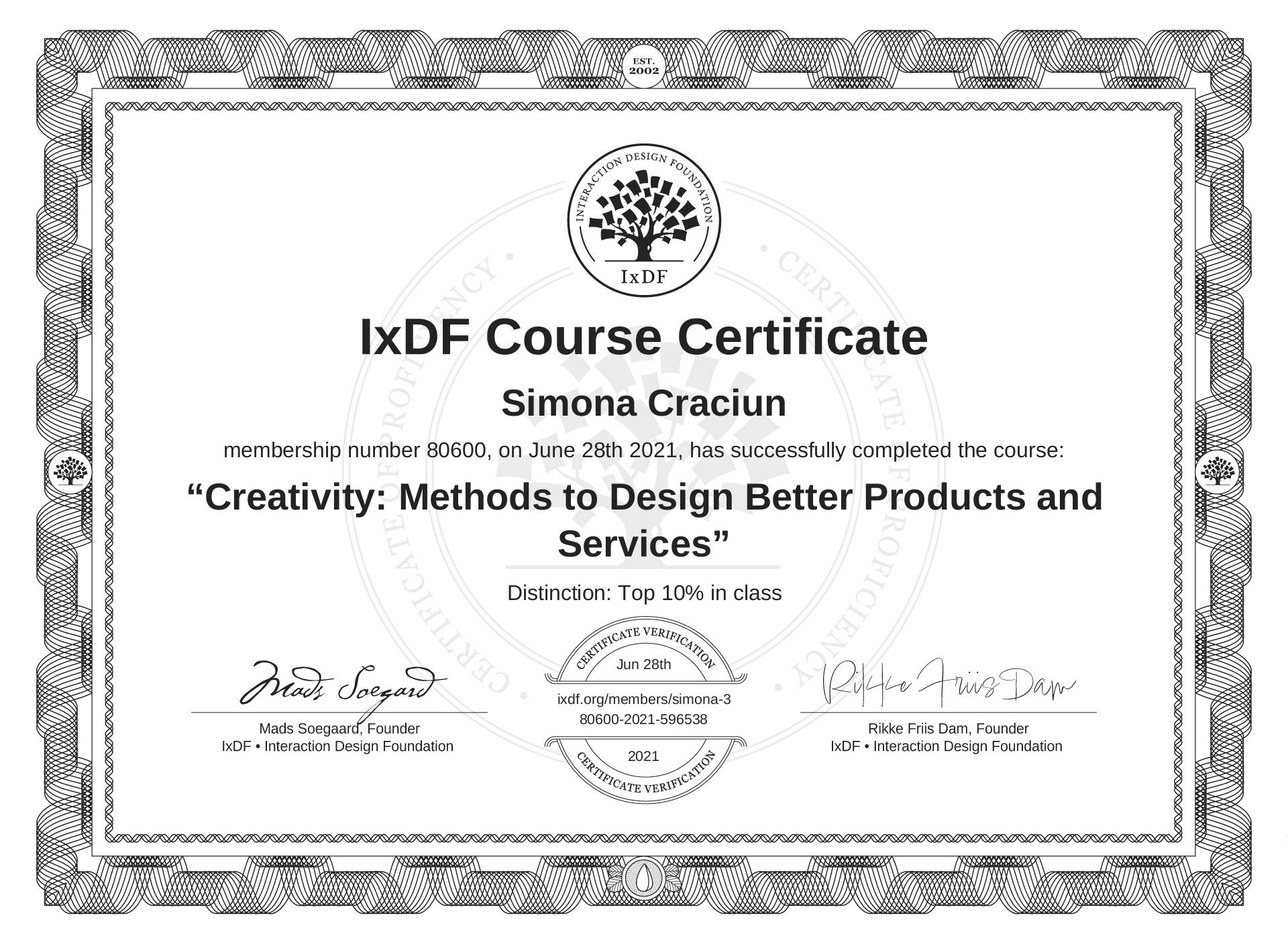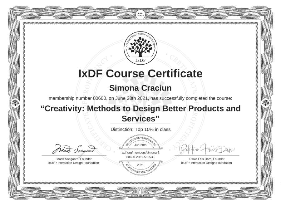 The IxDF Course Certificate above is awarded to Simona Craciun with a Top 10% Distinction in formal recognition of their coursework surpassing the rigorous benchmarks of exceptional performance established by the IxDF Educational Codex.