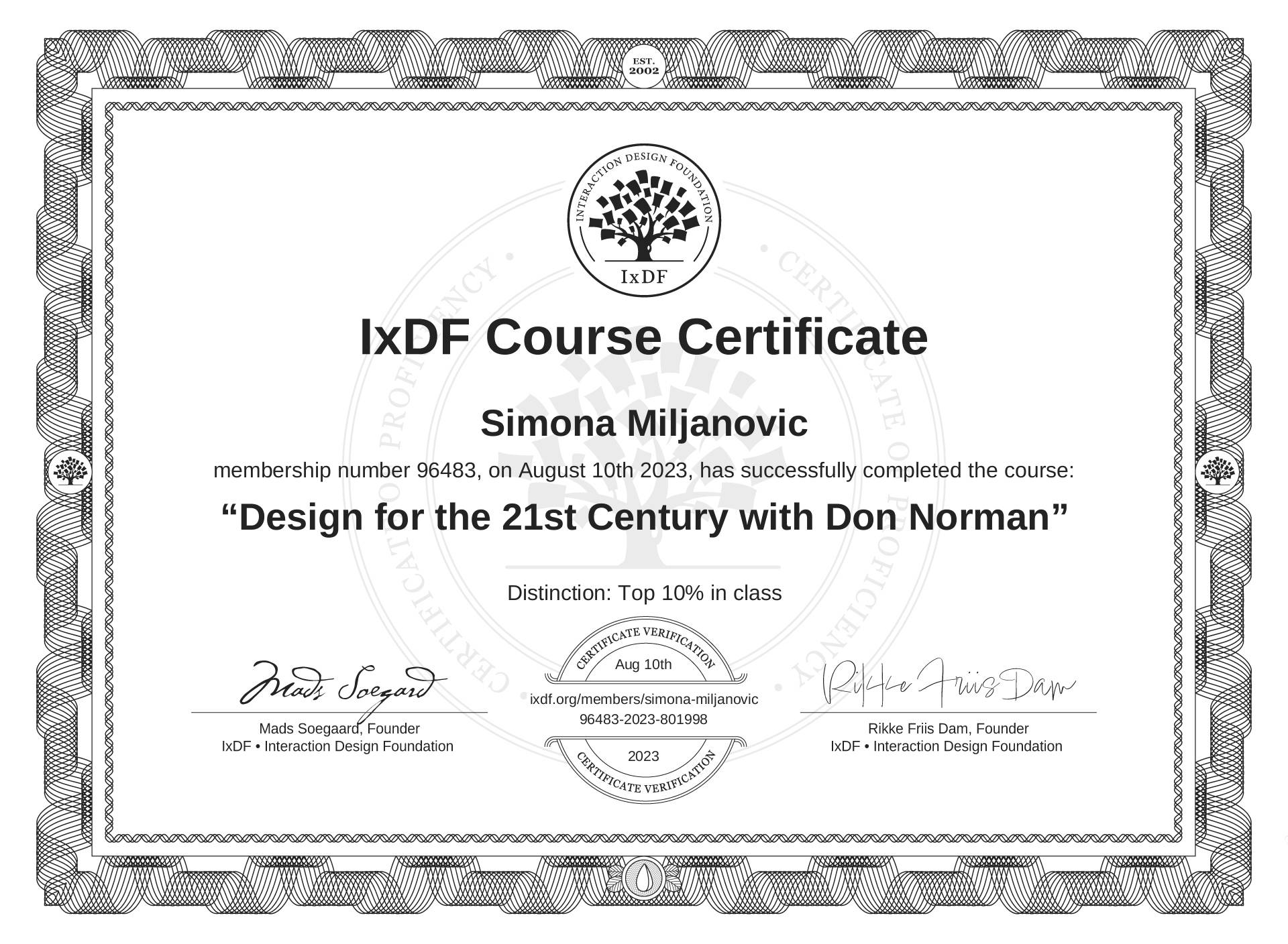 The IxDF Course Certificate above is awarded to Simona Miljanovic with a Top 10% Distinction in formal recognition of their coursework surpassing the rigorous benchmarks of exceptional performance established by the IxDF Educational Codex.