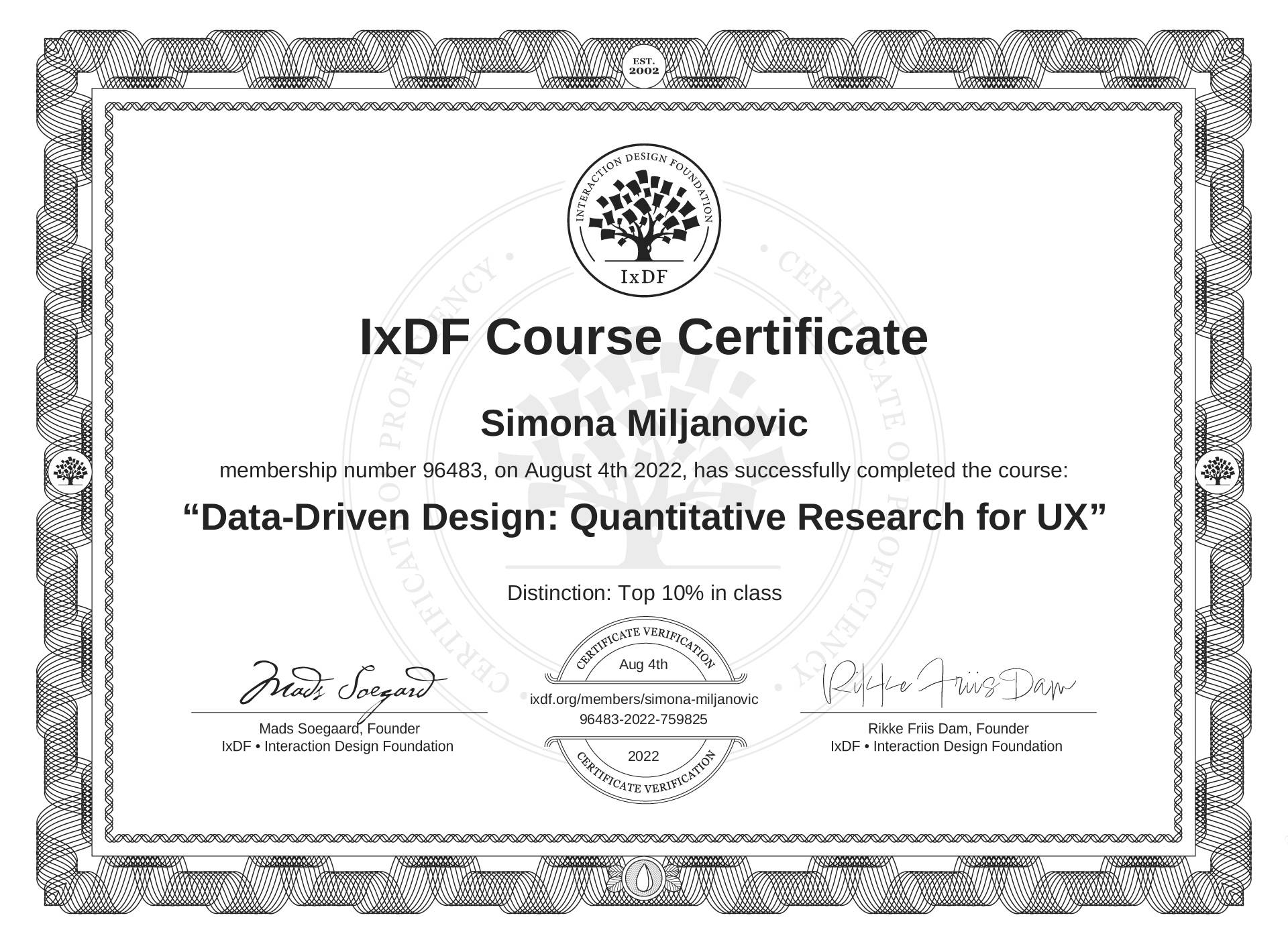 The IxDF Course Certificate above is awarded to Simona Miljanovic with a Top 10% Distinction in formal recognition of their coursework surpassing the rigorous benchmarks of exceptional performance established by the IxDF Educational Codex.
