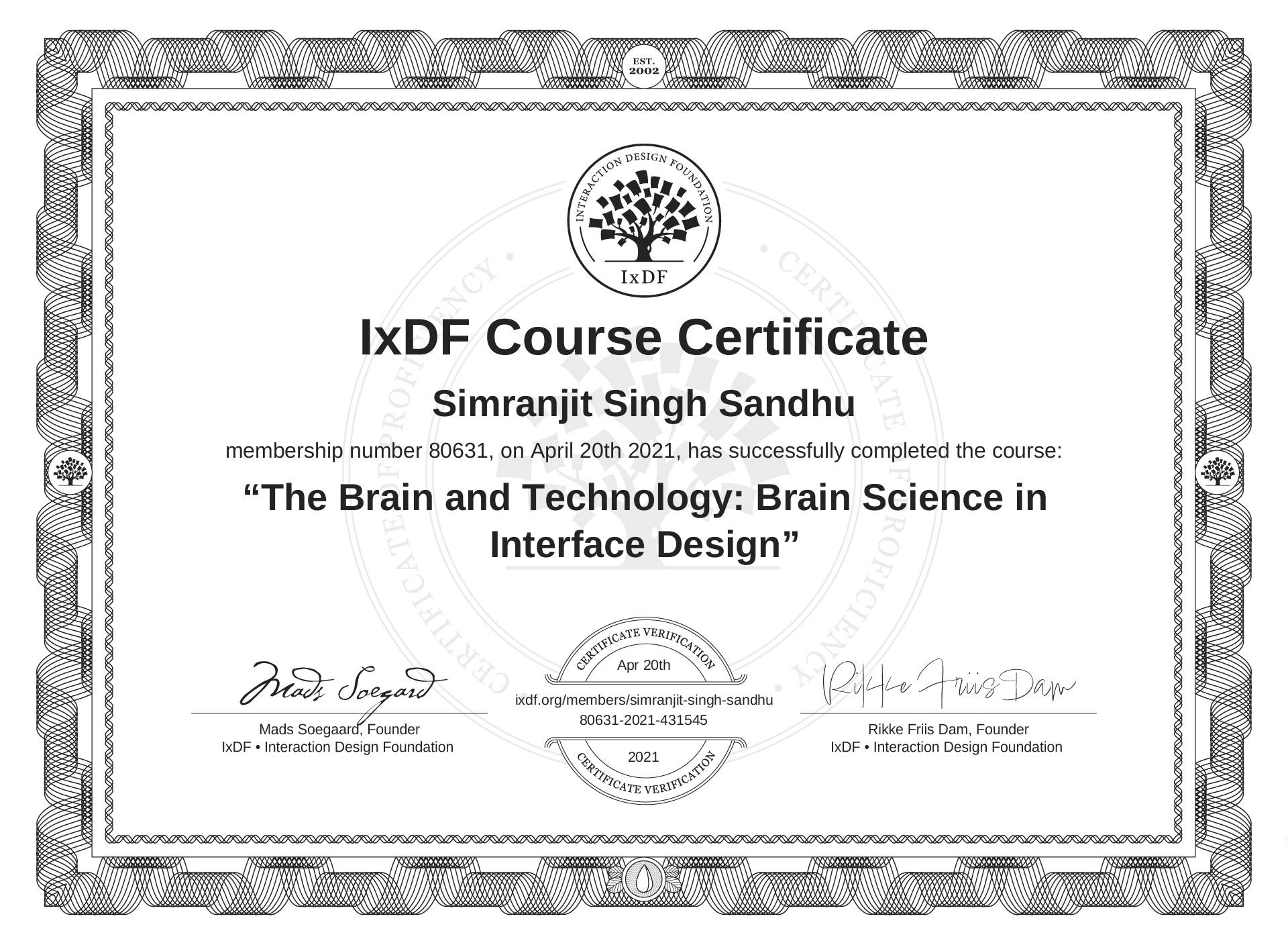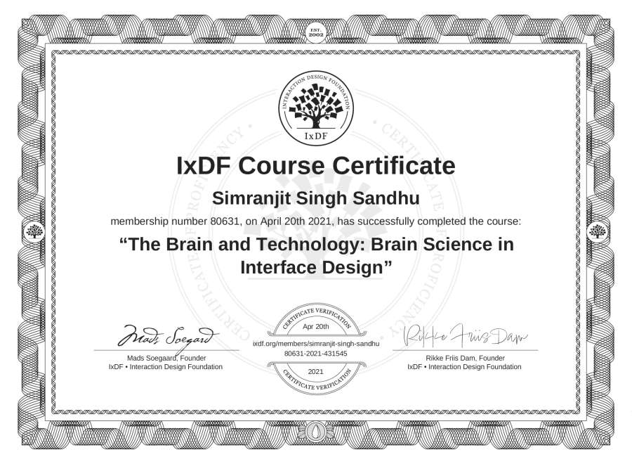 Simranjit Singh Sandhu's IxDF Course Certificate: The Brain and Technology: Brain Science in Interface Design