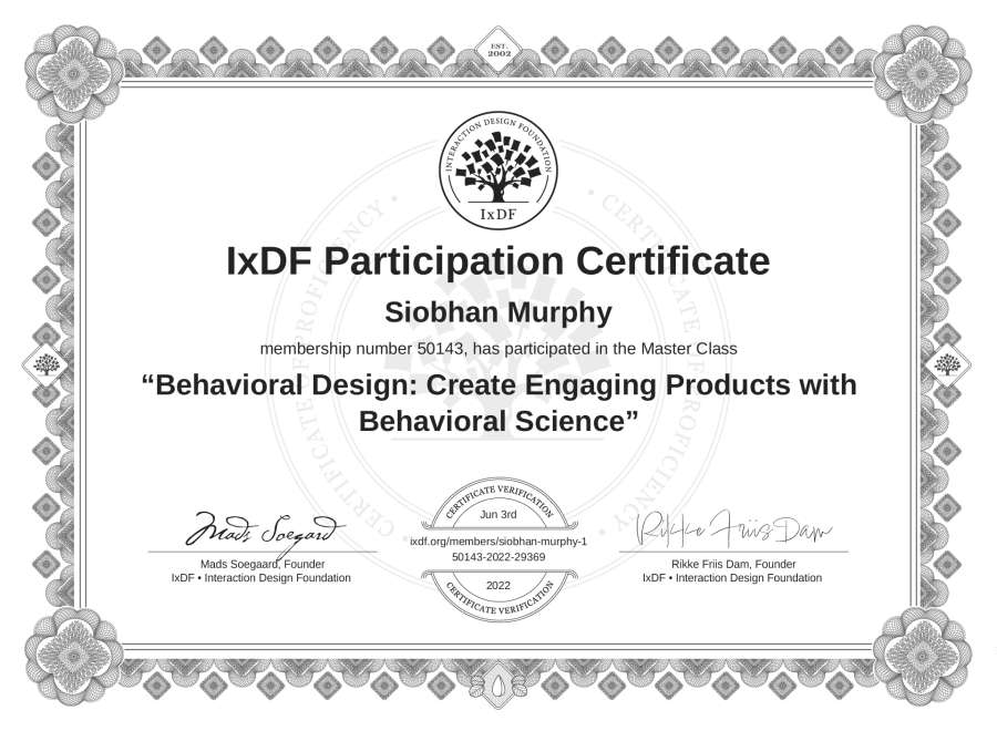 Siobhan Murphy's IxDF Masterclass Certificate: Behavioral Design: Create Engaging Products with Behavioral Science