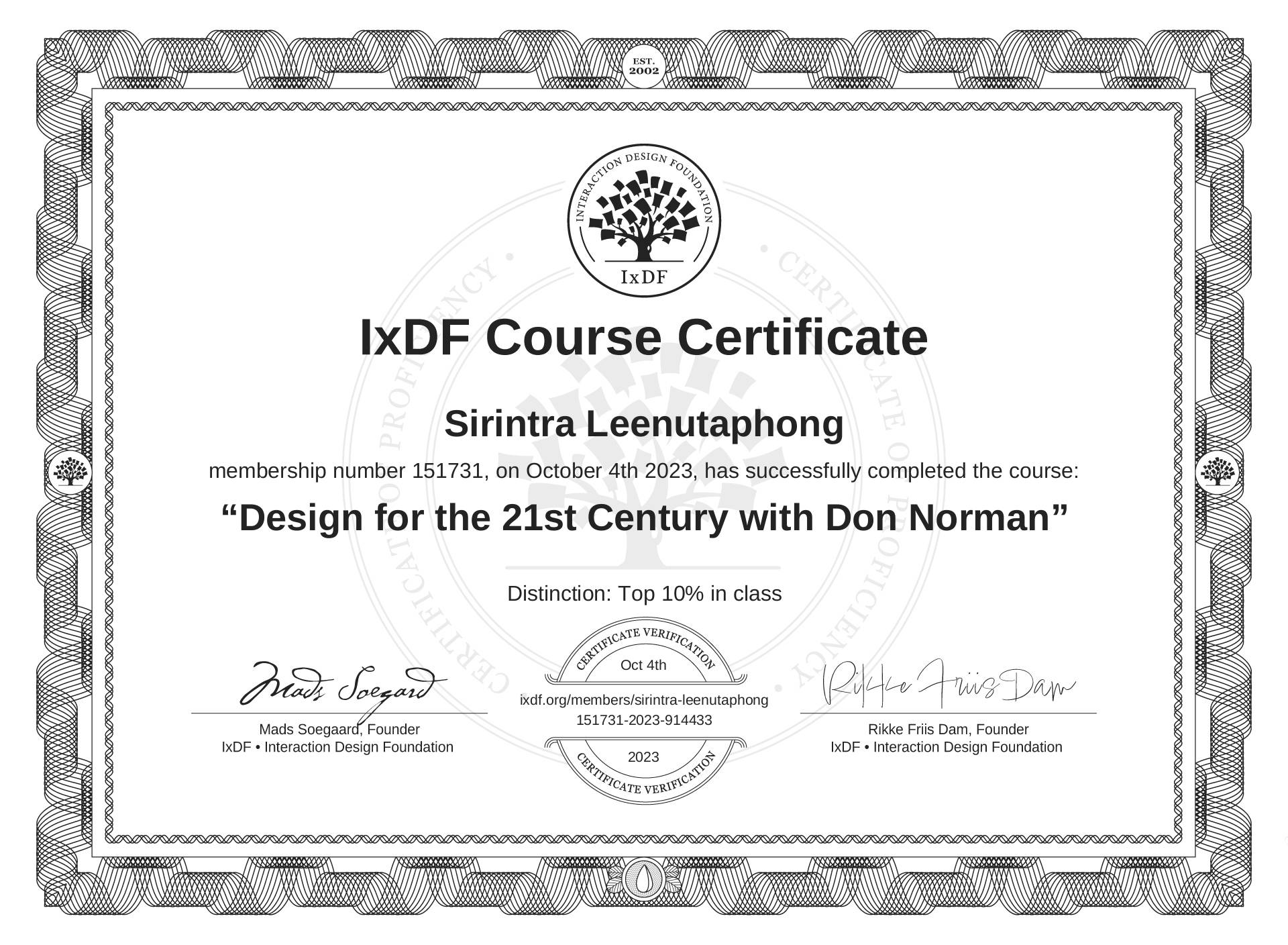 Sirintra Leenutaphong's IxDF Course Certificate: Design for the 21st Century with Don Norman