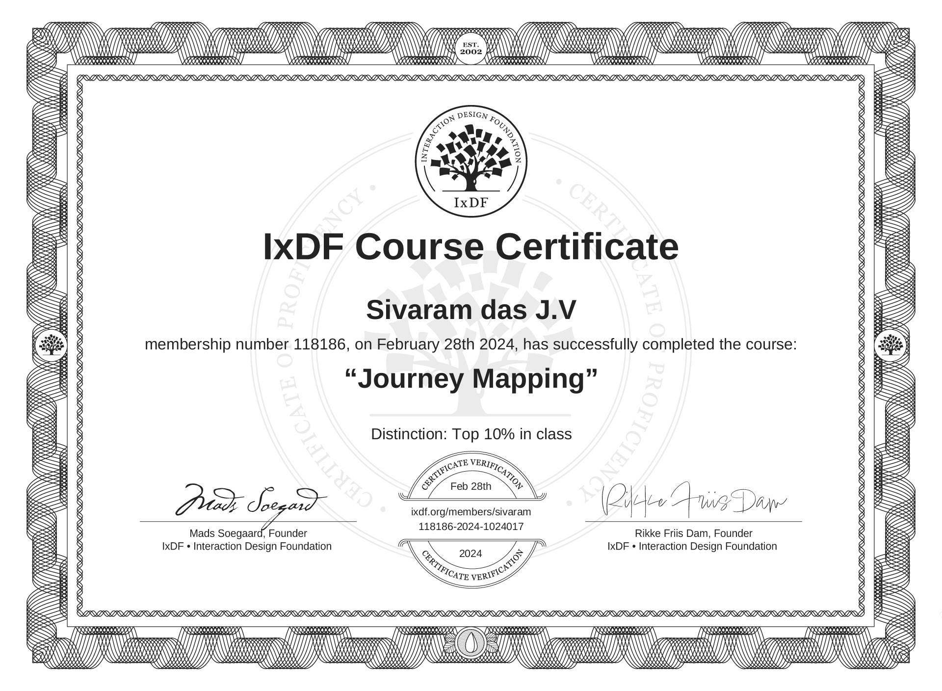 The IxDF Course Certificate above is awarded to Sivaram das J.V with a Top 10% Distinction in formal recognition of their coursework surpassing the rigorous benchmarks of exceptional performance established by the IxDF Educational Codex.