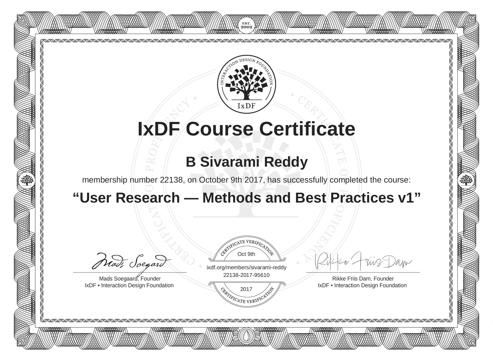 B Sivarami Reddy's IxDF Course Certificate: User Research — Methods and Best Practices v1