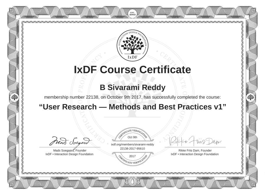B Sivarami Reddy's IxDF Course Certificate: User Research — Methods and Best Practices v1