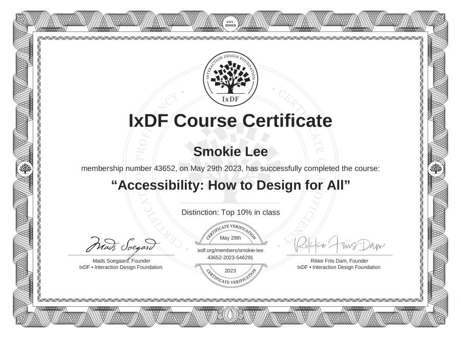 The IxDF Course Certificate above is awarded to Smokie Lee with a Top 10% Distinction in formal recognition of their coursework surpassing the rigorous benchmarks of exceptional performance established by the IxDF Educational Codex.