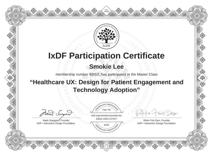 Smokie Lee's IxDF Masterclass Certificate: Healthcare UX: Design for Patient Engagement and Technology Adoption
