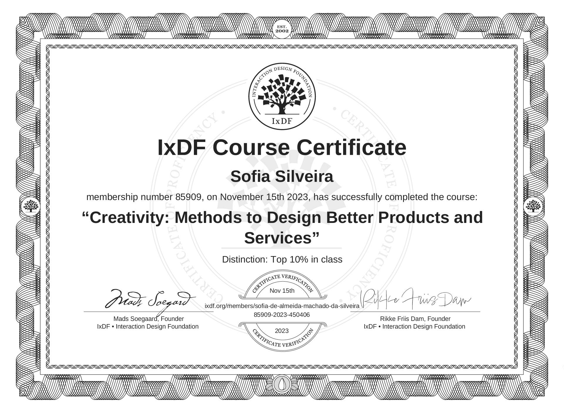 The IxDF Course Certificate above is awarded to Sofia Silveira with a Top 10% Distinction in formal recognition of their coursework surpassing the rigorous benchmarks of exceptional performance established by the IxDF Educational Codex.
