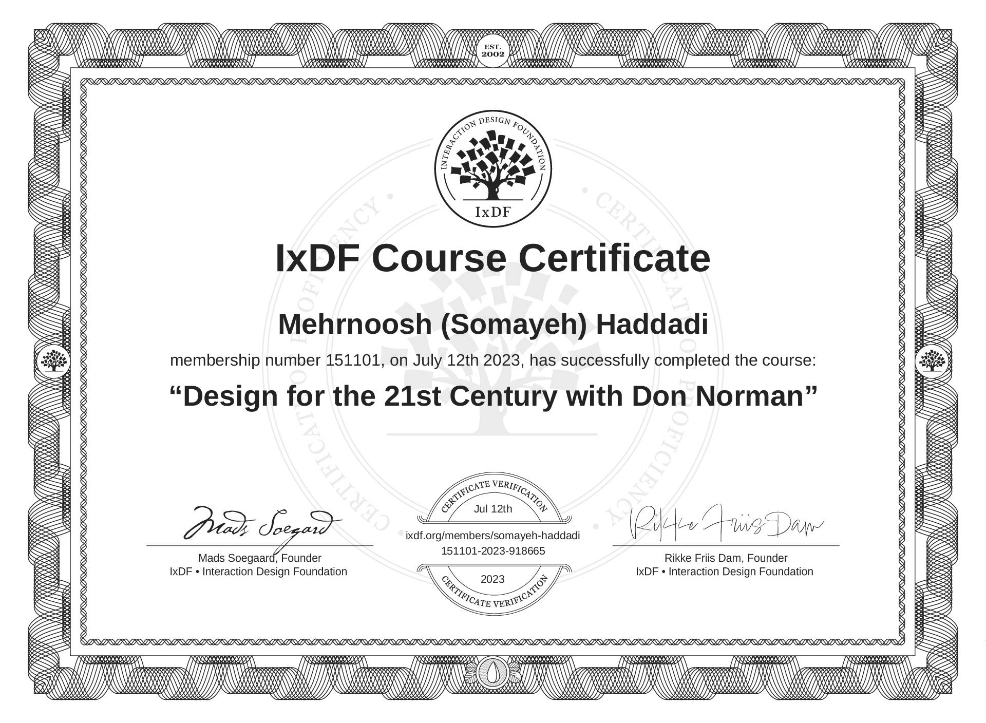 The IxDF Course Certificate above is awarded to Mehrnoosh (Somayeh) Haddadi in formal recognition of their coursework surpassing the rigorous benchmarks of exceptional performance established by the IxDF Educational Codex.