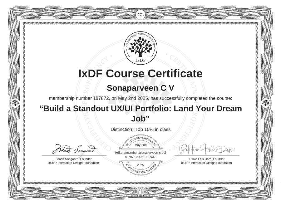 Sonaparveen C V's IxDF Course Certificate: Build a Standout UX/UI Portfolio: Land Your Dream Job