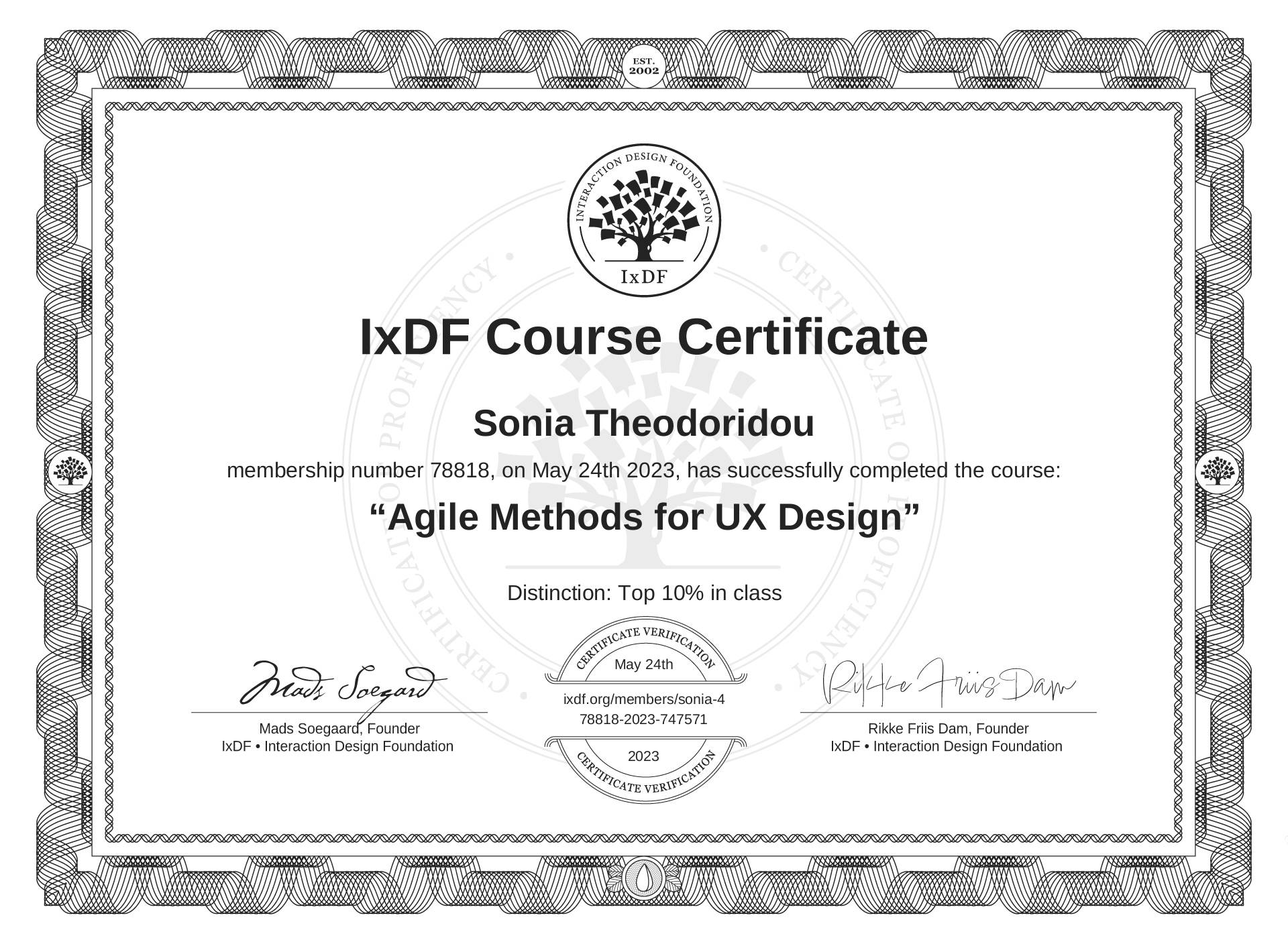 The IxDF Course Certificate above is awarded to Sonia Theodoridou with a Top 10% Distinction in formal recognition of their coursework surpassing the rigorous benchmarks of exceptional performance established by the IxDF Educational Codex.