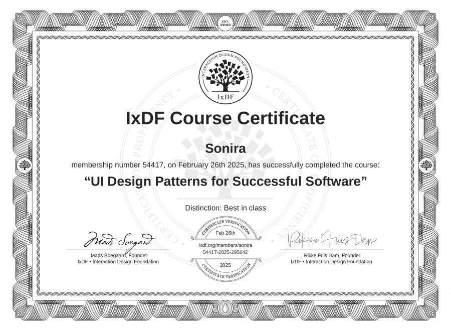 Sonira's IxDF Course Certificate: UI Design Patterns for Successful Software