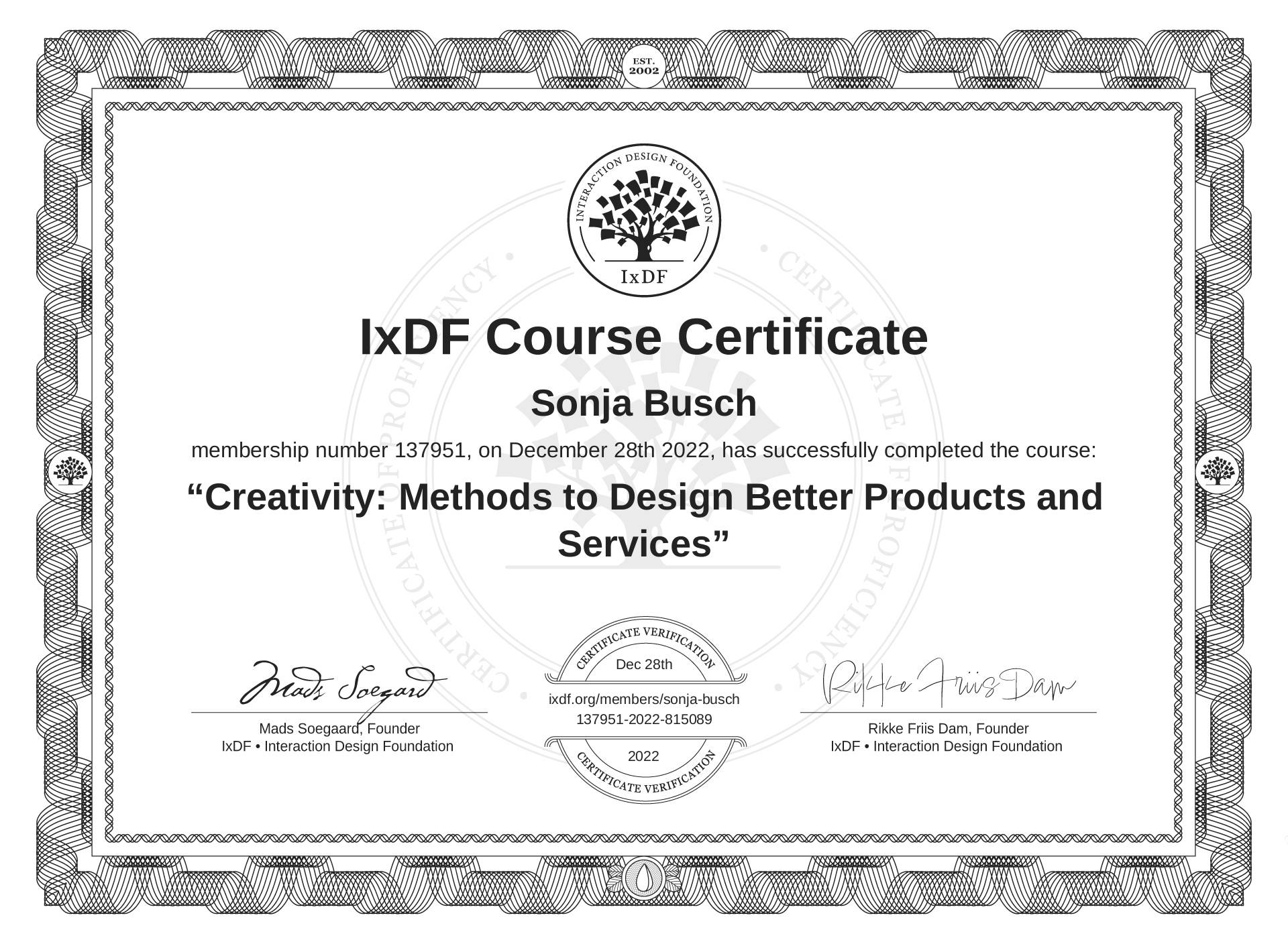The IxDF Course Certificate above is awarded to Sonja Busch in formal recognition of their coursework surpassing the rigorous benchmarks of exceptional performance established by the IxDF Educational Codex.