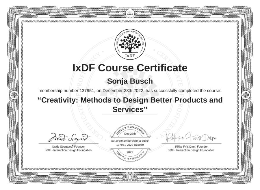 Sonja Busch's IxDF Course Certificate: Creativity: Methods to Design Better Products and Services