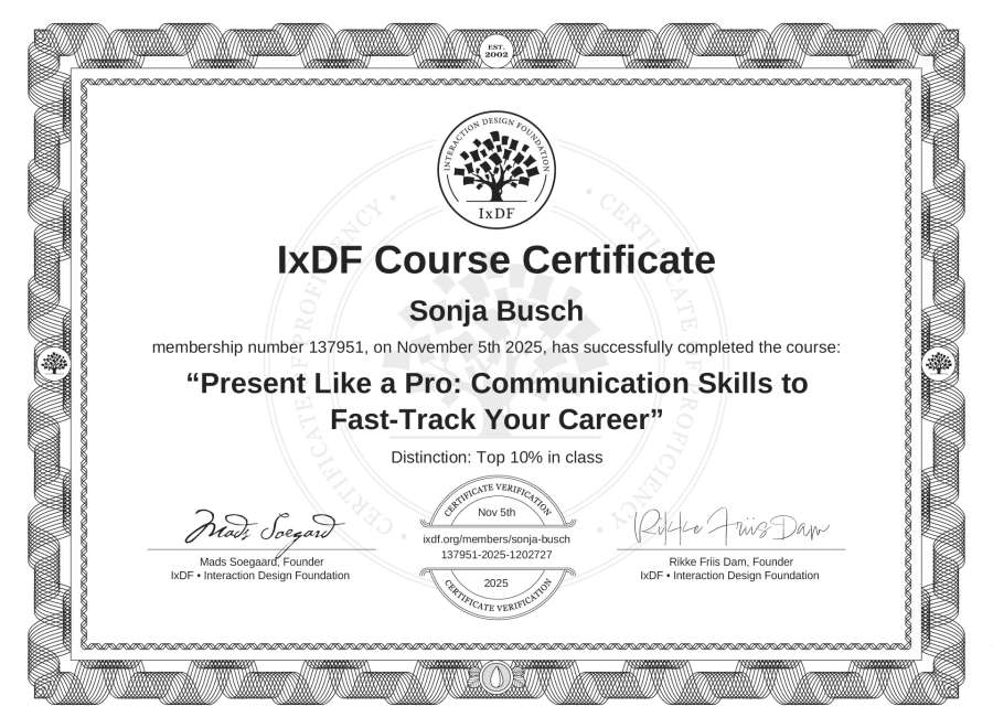Sonja Busch's IxDF Course Certificate: Present Like a Pro: Communication Skills to Fast-Track Your Career