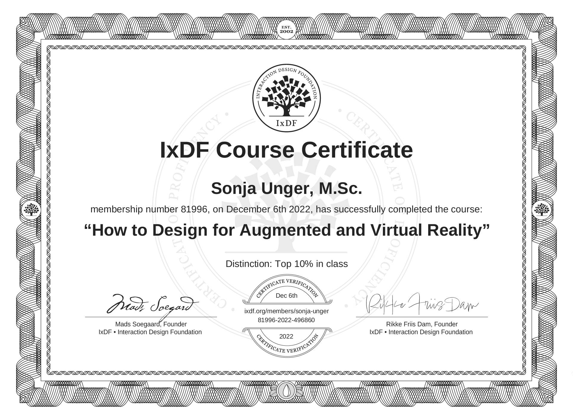 The IxDF Course Certificate above is awarded to Sonja Unger, M.Sc. with a Top 10% Distinction in formal recognition of their coursework surpassing the rigorous benchmarks of exceptional performance established by the IxDF Educational Codex.