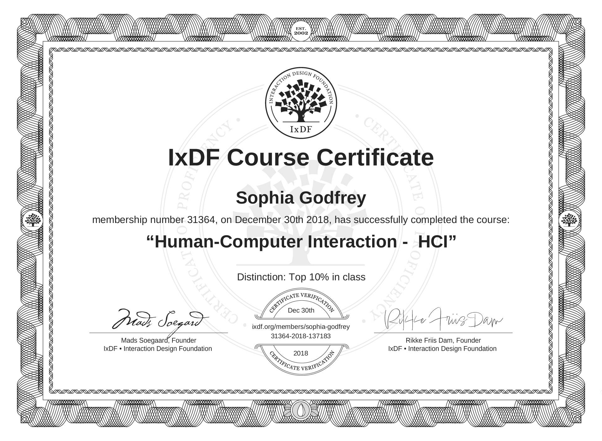 The IxDF Course Certificate above is awarded to Sophia Godfrey with a Top 10% Distinction in formal recognition of their coursework surpassing the rigorous benchmarks of exceptional performance established by the IxDF Educational Codex.