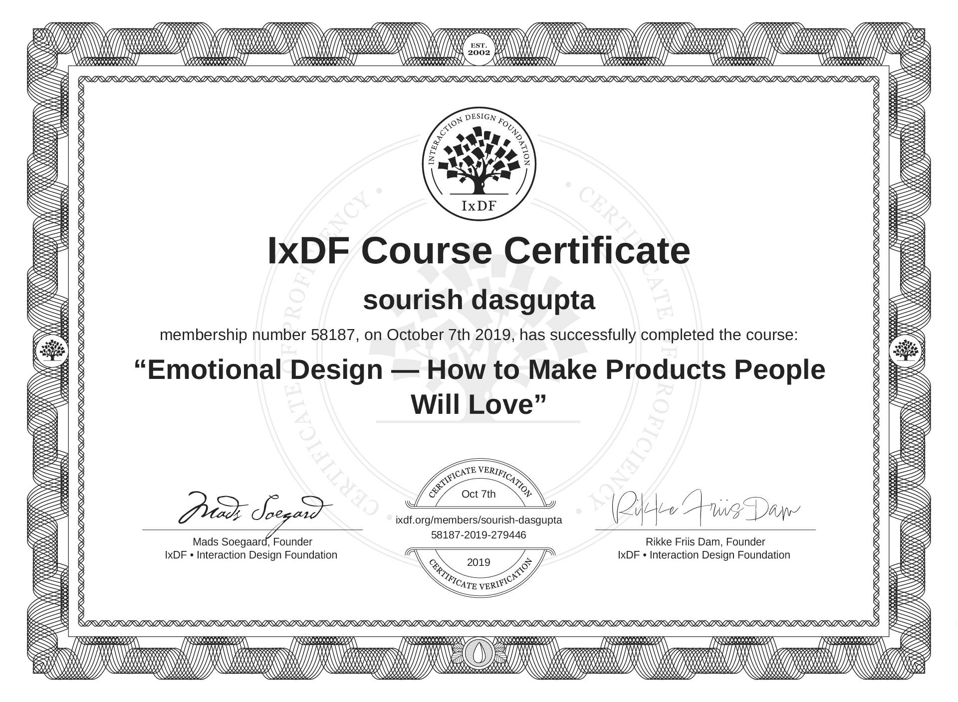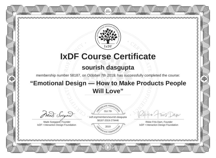 sourish dasgupta's IxDF Course Certificate: Emotional Design — How to Make Products People Will Love
