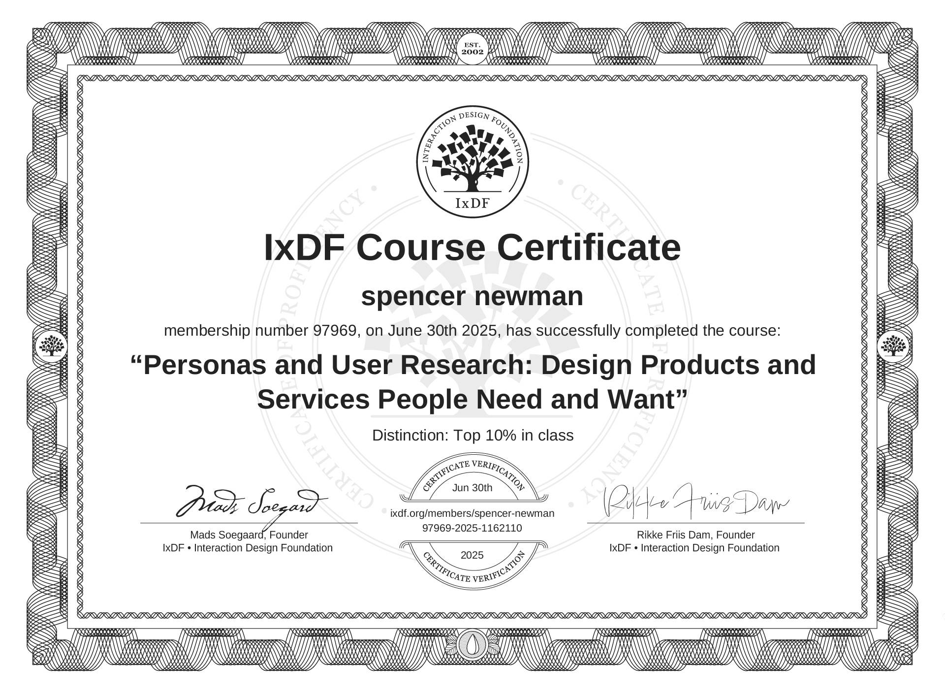The IxDF Course Certificate above is awarded to spencer newman with a Top 10% Distinction in formal recognition of their coursework surpassing the rigorous benchmarks of exceptional performance established by the IxDF Educational Codex.
