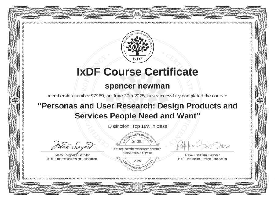 spencer newman's IxDF Course Certificate: Personas and User Research: Design Products and Services People Need and Want