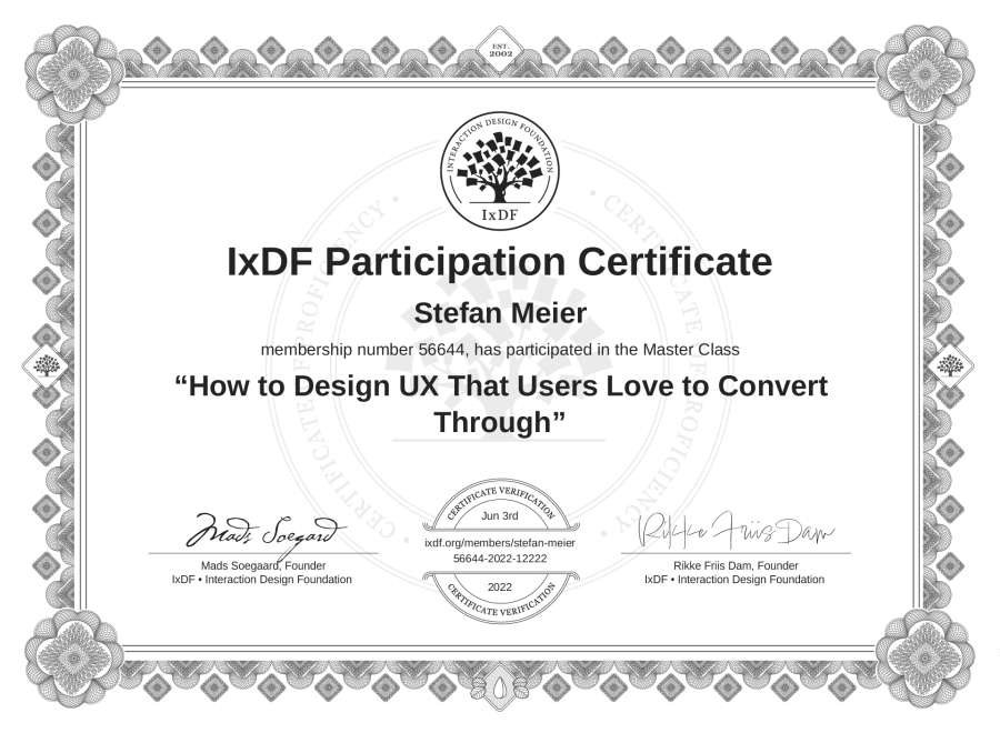 Stefan Meier's IxDF Masterclass Certificate: How to Design UX That Users Love to Convert Through