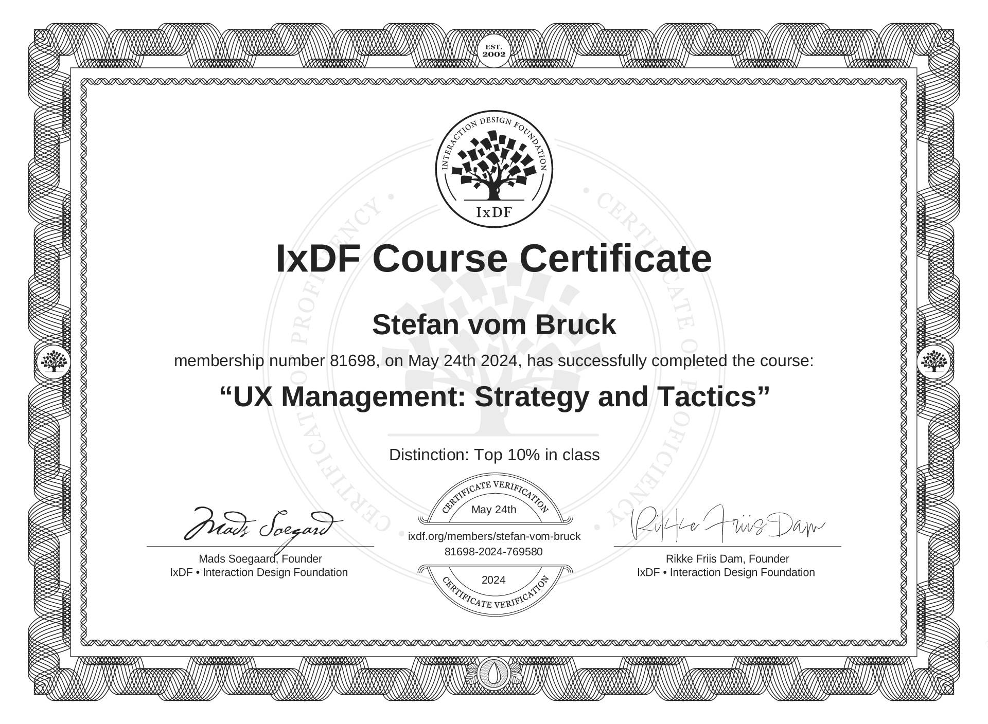 The IxDF Course Certificate above is awarded to Stefan vom Bruck with a Top 10% Distinction in formal recognition of their coursework surpassing the rigorous benchmarks of exceptional performance established by the IxDF Educational Codex.