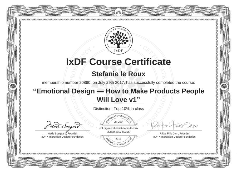 Stefanie le Roux's IxDF Course Certificate: Emotional Design — How to Make Products People Will Love v1