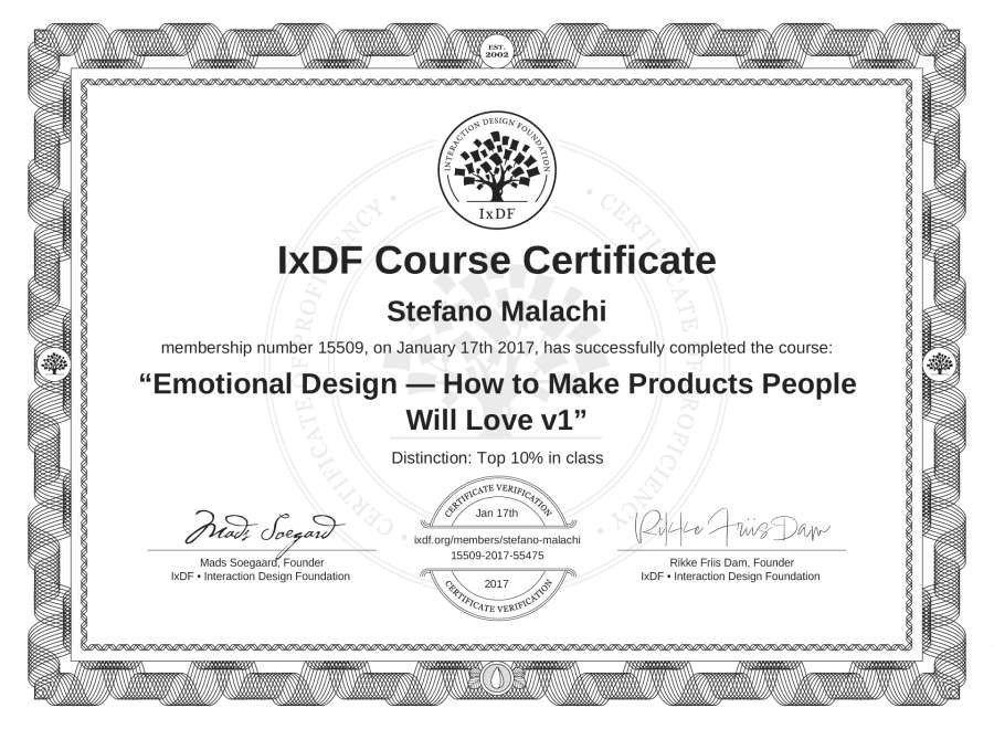 Stefano Malachi's IxDF Course Certificate: Emotional Design — How to Make Products People Will Love v1