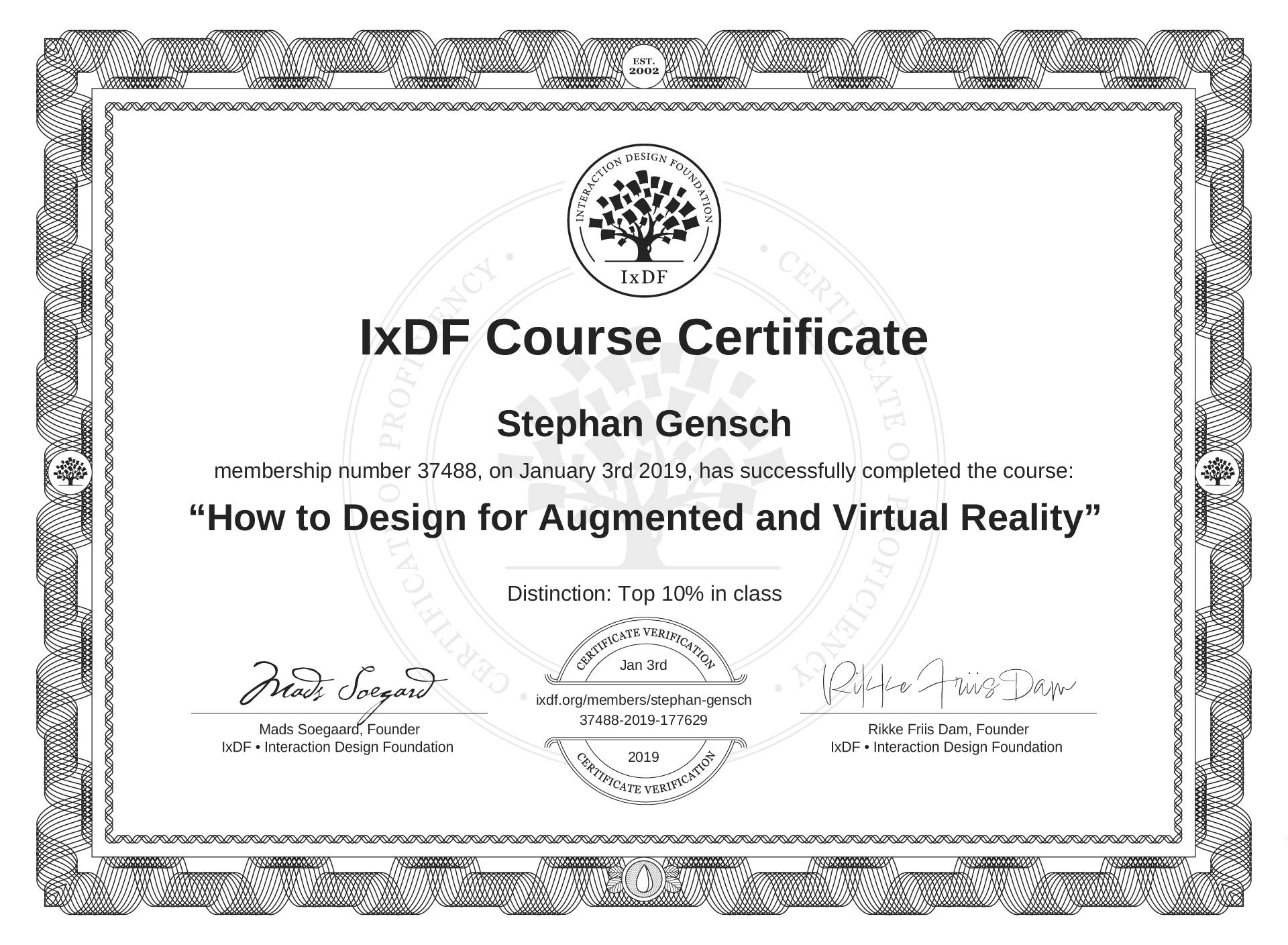 Stephan Gensch's IxDF Course Certificate: How to Design for Augmented and Virtual Reality
