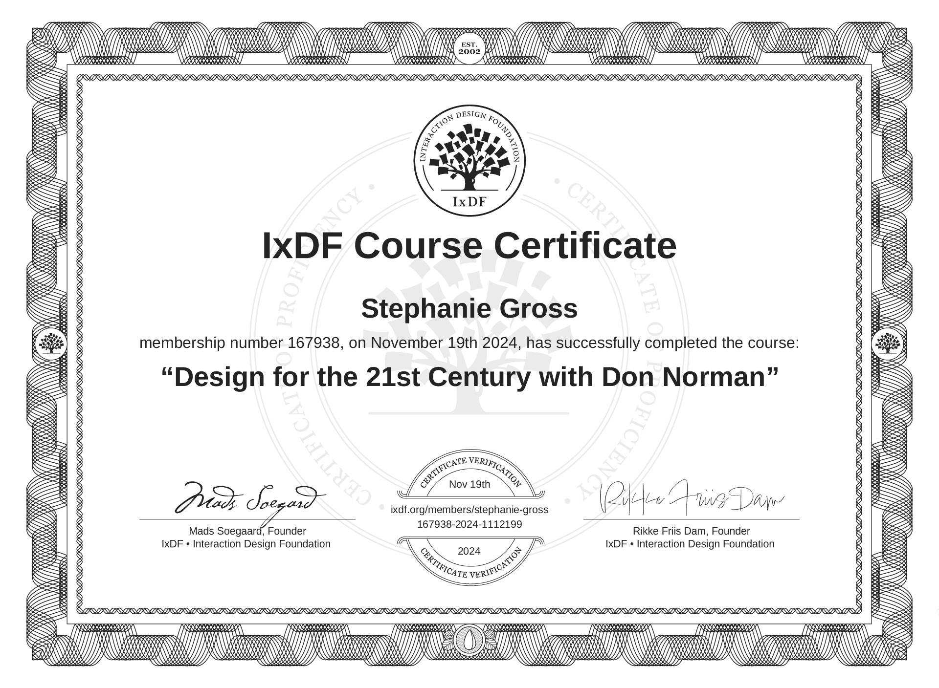The IxDF Course Certificate above is awarded to Stephanie Gross in formal recognition of their coursework surpassing the rigorous benchmarks of exceptional performance established by the IxDF Educational Codex.