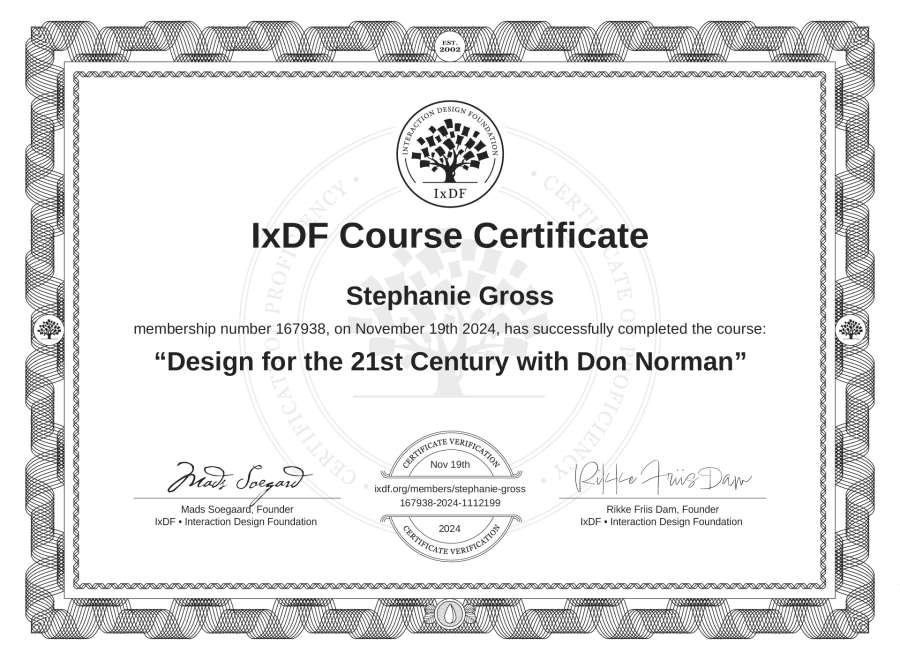 Stephanie Gross's IxDF Course Certificate: Design for the 21st Century with Don Norman