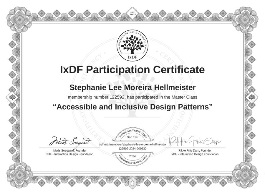 Stephanie Lee Moreira Hellmeister's IxDF Masterclass Certificate: Accessible and Inclusive Design Patterns