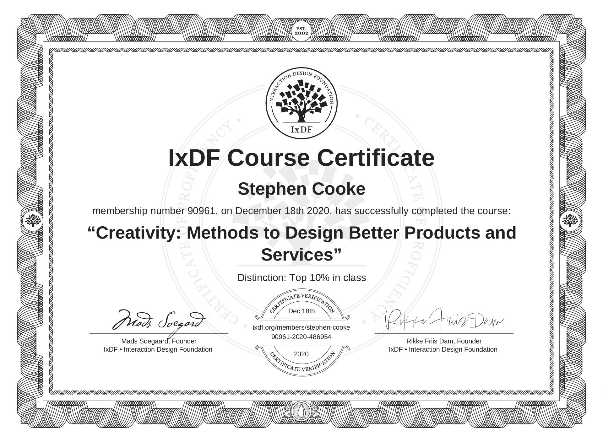 Stephen Cooke's IxDF Course Certificate: Creativity: Methods to Design Better Products and Services