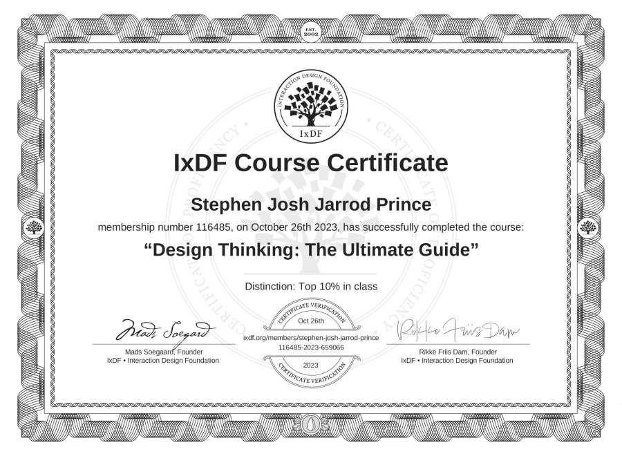 The IxDF Course Certificate above is awarded to Stephen Josh Jarrod Prince with a Top 10% Distinction in formal recognition of their coursework surpassing the rigorous benchmarks of exceptional performance established by the IxDF Educational Codex.