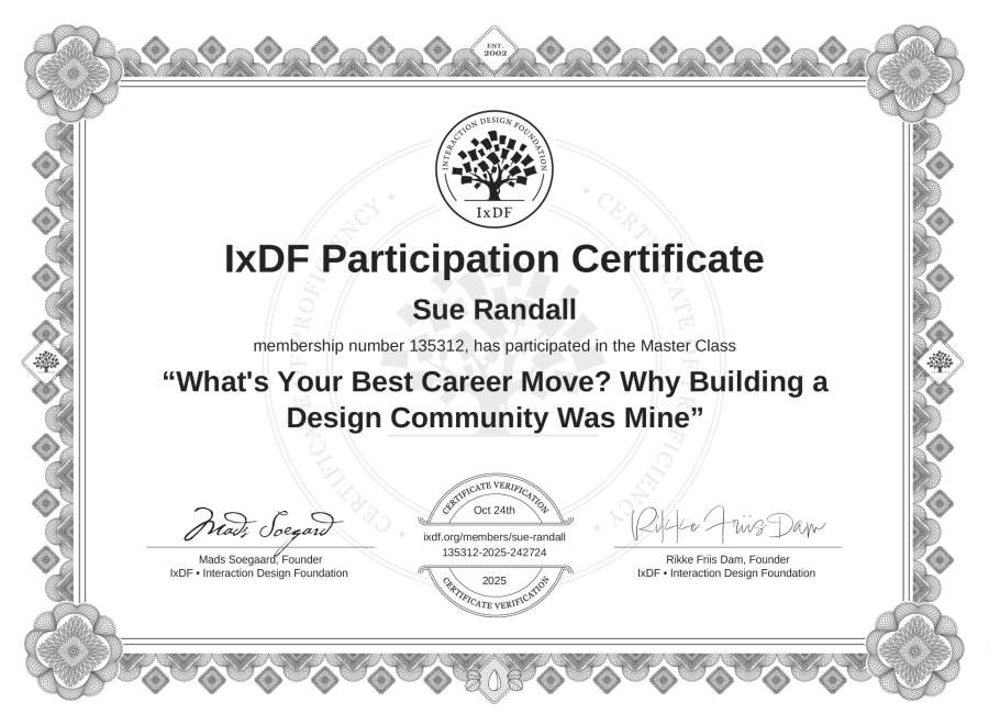 Sue Randall's IxDF Masterclass Certificate: What's Your Best Career Move? Why Building a Design Community Was Mine