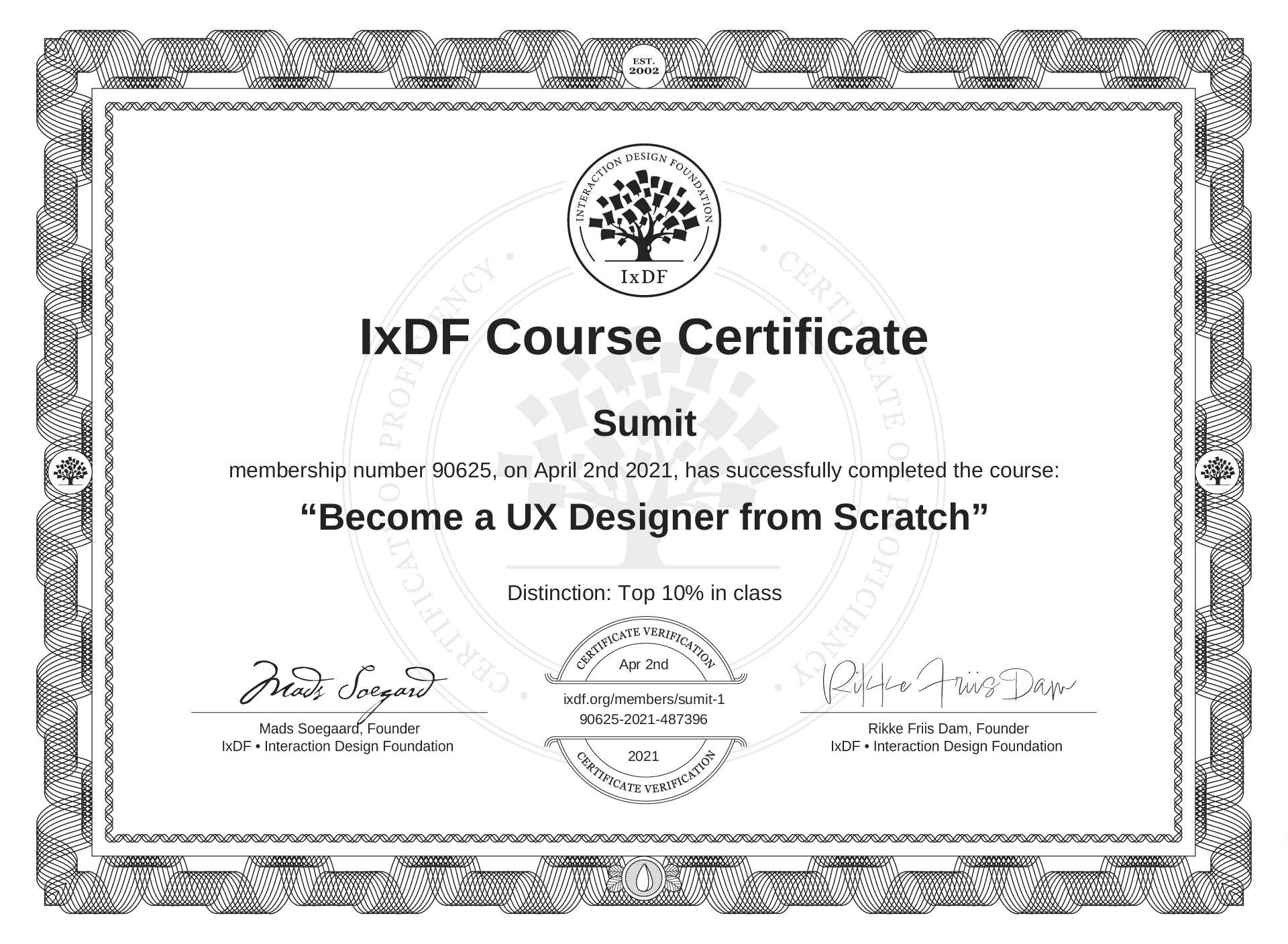 The IxDF Course Certificate above is awarded to Sumit with a Top 10% Distinction in formal recognition of their coursework surpassing the rigorous benchmarks of exceptional performance established by the IxDF Educational Codex.