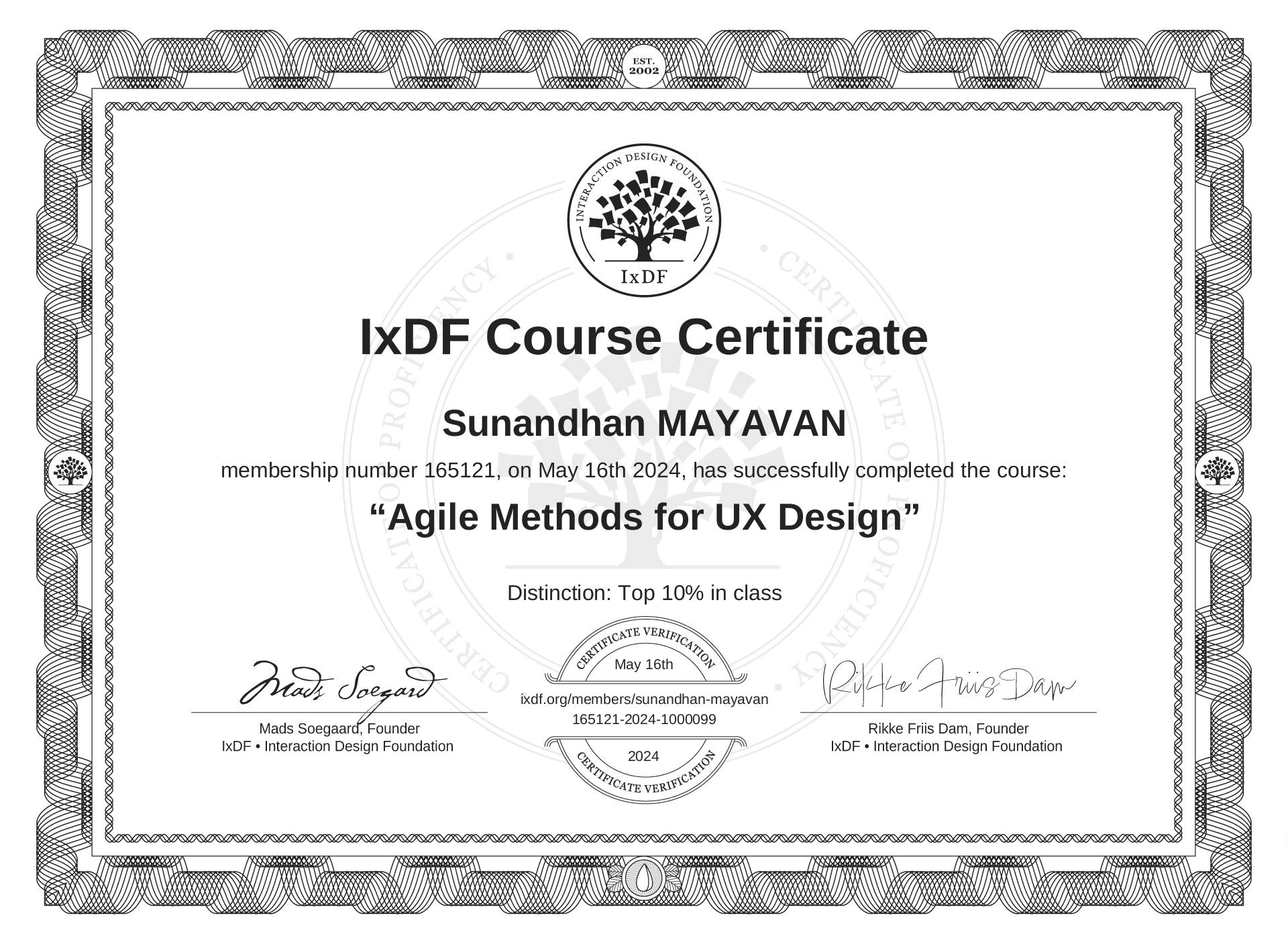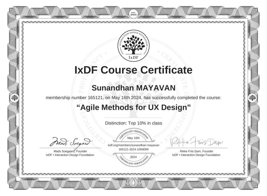 Sunandhan MAYAVAN's IxDF Course Certificate: Agile Methods for UX Design
