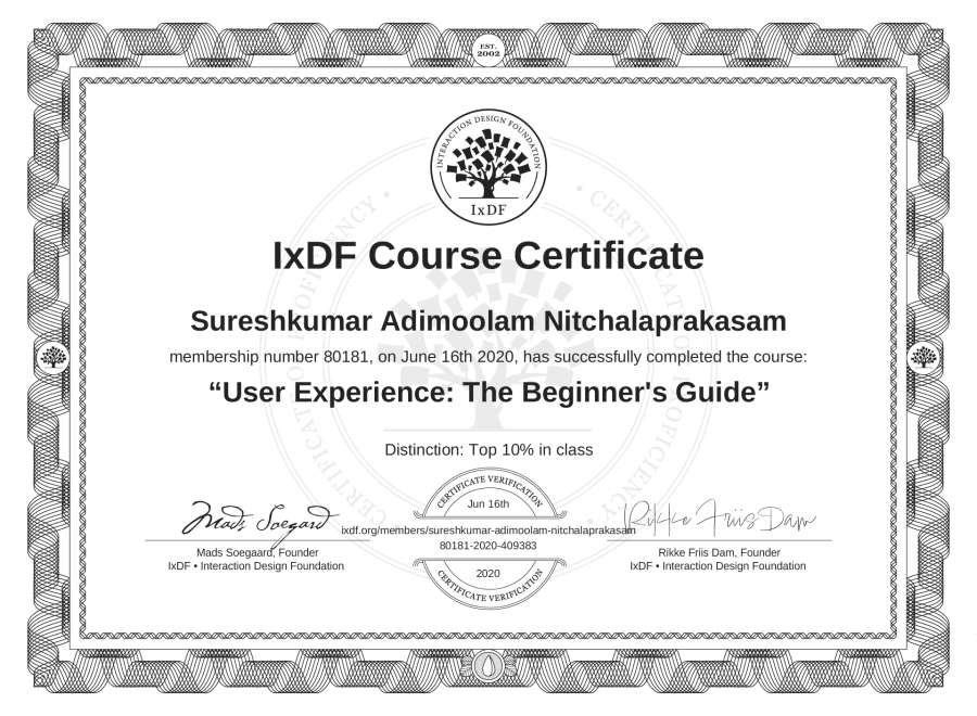 The IxDF Course Certificate above is awarded to Sureshkumar Adimoolam Nitchalaprakasam with a Top 10% Distinction in formal recognition of their coursework surpassing the rigorous benchmarks of exceptional performance established by the IxDF Educational Codex.