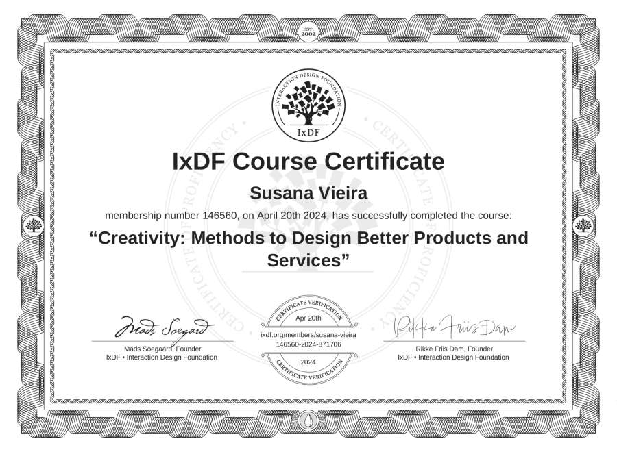 Susana Vieira's IxDF Course Certificate: Creativity: Methods to Design Better Products and Services