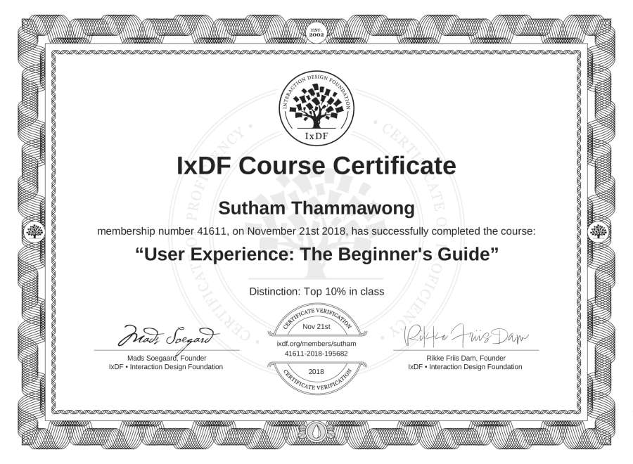 The IxDF Course Certificate above is awarded to Sutham Thammawong with a Top 10% Distinction in formal recognition of their coursework surpassing the rigorous benchmarks of exceptional performance established by the IxDF Educational Codex.