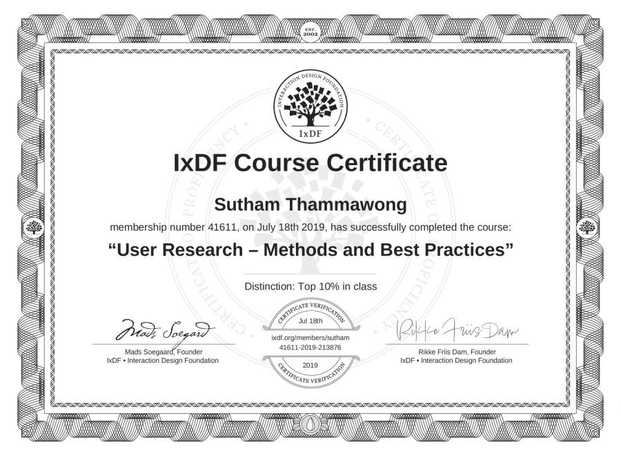 Sutham Thammawong's IxDF Course Certificate: User Research – Methods and Best Practices