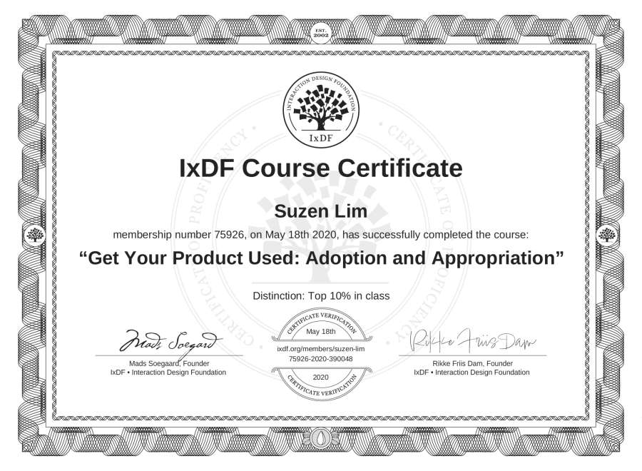 Suzen Lim's IxDF Course Certificate: Get Your Product Used: Adoption and Appropriation