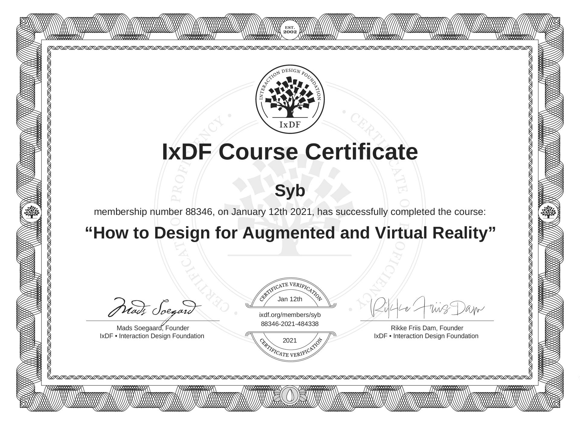 Syb's IxDF Course Certificate: How to Design for Augmented and Virtual Reality